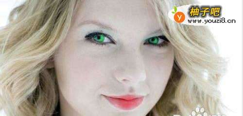 7我们把照片美女的蓝色眼睛换成绿色的,将唇彩的颜色调成红色的,效果是这样子