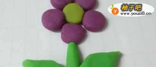 4最后再用绿色捏两个枣核的形状,粘在花茎两侧,当作两片叶子,小花就做完了。