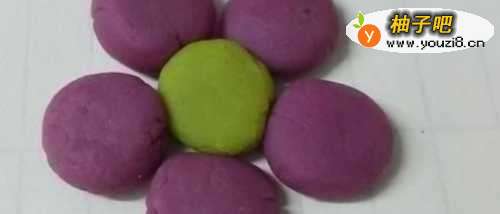 2接着再将紫色橡皮泥团成五个小圆球,粘在黄色花芯的周围,当作五片花瓣。