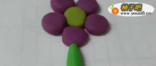 3然后用绿色橡皮泥搓一个粗粗的长条,粘在花朵的下面,当作小花的花茎。