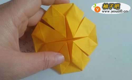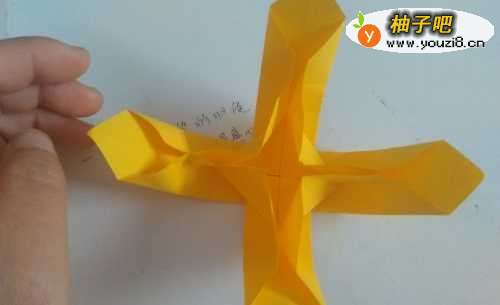 4折好后就是图一的样子,然后再把四个角向内折,如图二。折好后,我们再把角向后翻折就形成了图三。