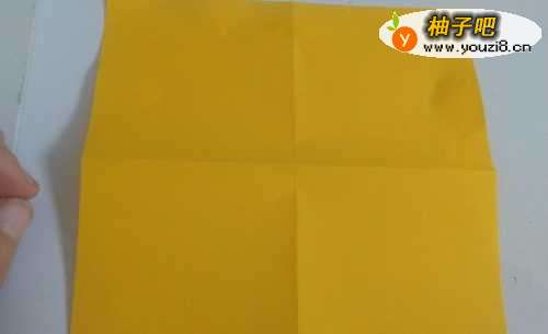 3另两侧同样操作,然后把四个角向内折,如图二。再把两角之间的边向内折,如图三。