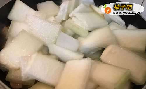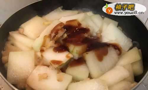 8炒一会后,在冬瓜上倒入适量的蚝油。
