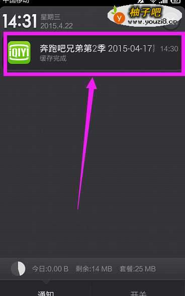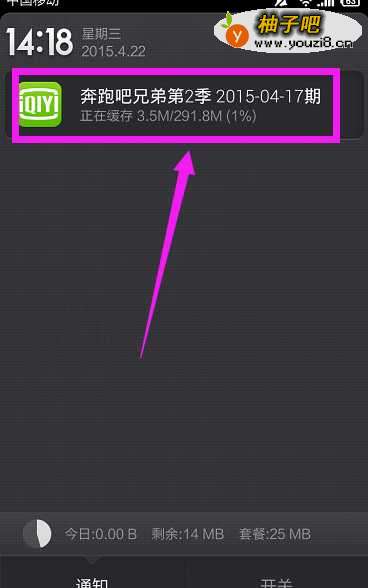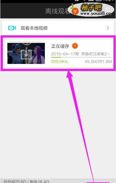 8在手机屏幕的通知栏里面,可以看到目前正在下载的这个视频的进度,缓存了多少M,下载到了百分之几都清清楚楚。另外再回到我们刚才离线视频的那个页面,会在那个下载的视频的右下角看到一个小小的绿色的向下箭头的按钮哦,表示目前正在下载呢。
