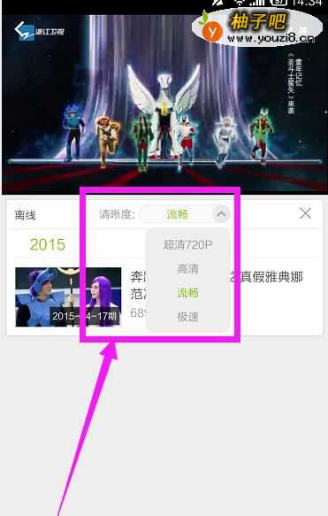 5进入”离线“的界面之后,可以见到有一栏”清晰度“,默认的是”流畅“,我们可以点一下旁边的那个向上的箭头,会展开很多个选项,可以自己在里面选择需要的画质。当然,越清晰的视频,体积肯定也会越大的哦。