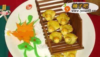 一.小鸡酥 小鸡酥选用精面粉、沙律油、豆沙为主原料。首先将水油皮、小包酥擀成皮,包入豆沙成型,入烤箱烤制而成。出品之小鸡酥外形小巧可爱,未尝已是飘香四溢,咬一口,外酥内滑,甜而适口,是一道老少皆宜的精致小点。