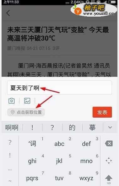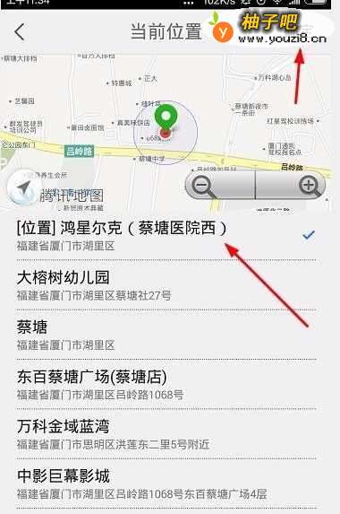5同时我们还可以发布我们所在的地理位置,点击获取当前位置,然后在获取的地址栏列表中找到离我们最近的位置,点击确定