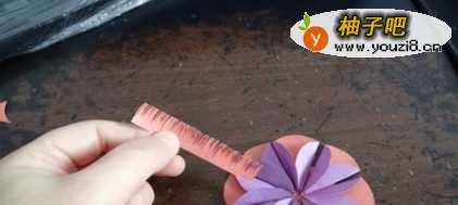 5我们把一根长条纸剪成穗子,卷起来,用胶水把它粘在花朵的中心位置。