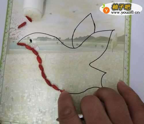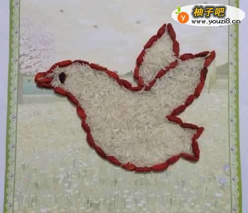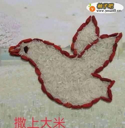 6第睡愁六步:最后将大米撒到小鸟的身体里面,如果需要收藏挂图,可以将液体胶水撒到大米上面,吹干后即可。