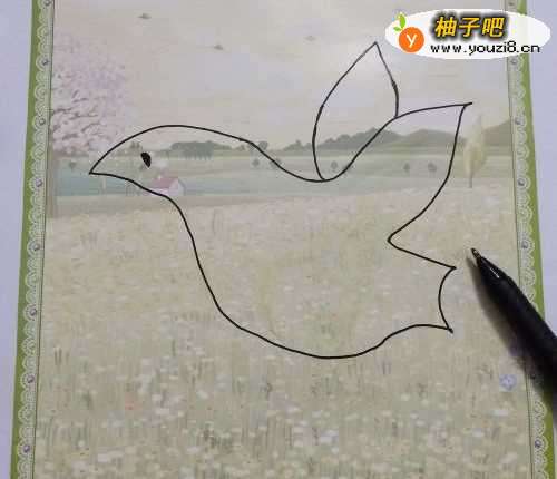 2第二步:用黑色的签字笔在彩色卡纸上画出鸟的形状,如下图所法。