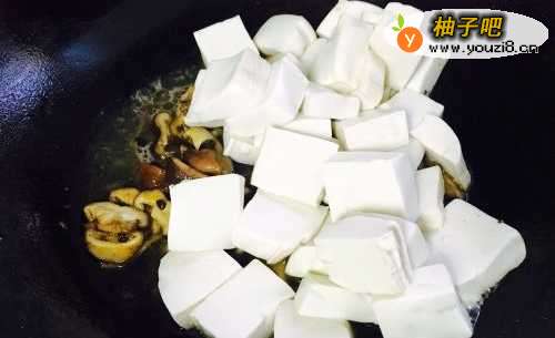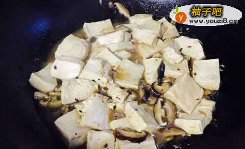 3香菇翻炒1分钟后变软即可把焯好水的豆腐倒进去,然后加入1小碗水,同时放1勺蚝油,开大火烧开。