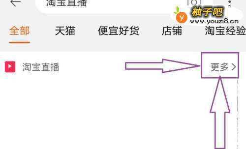 2在搜索栏中键入“淘宝直播”,进行搜索,即可在搜索栏下方看到很多的淘宝直播间,在淘宝直播间的右上角可以看到“更多”。