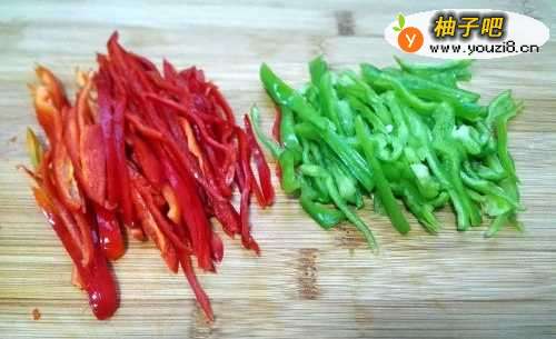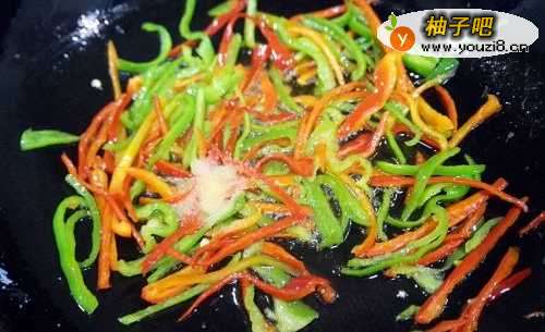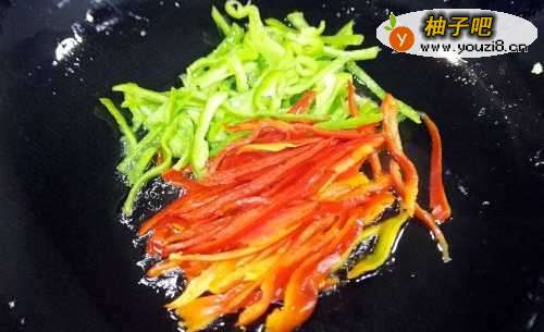 5在锅里再添加一点点油,倒入青红椒丝,大火翻炒几下。