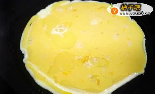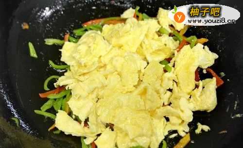 4烧热锅放入一点点油,把鸭蛋液倒入锅中,快速炒散后倒出来备用。