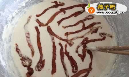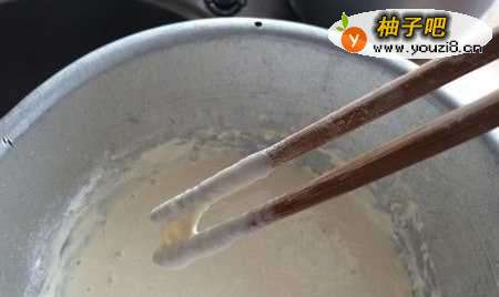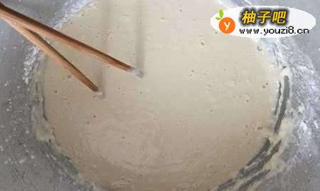 3然后慢慢地加入水,边加水边搅拌。面糊不能太稠也不能太稀。试着用筷子挑起来,面糊能沿着筷子缓慢流下即可。