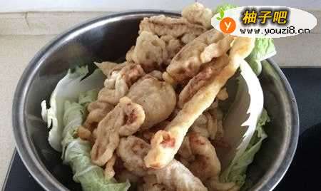 7第二遍炸的时候,要把酥肉炸至金黄色。然后就可以捞出来控油了。也可以在盆子底部摆放两片白菜叶,目的是吸油。