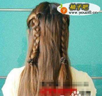 头顶两侧的头发分别编两个麻花辫。
