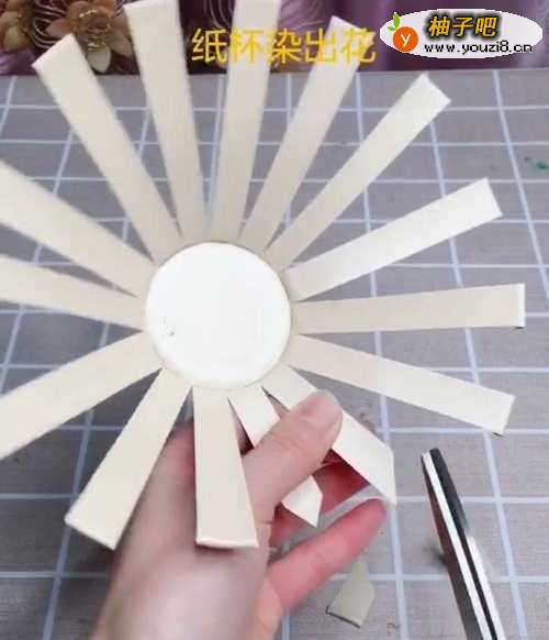 4我们利用剪刀,把这一些纸杯花朵多余的部分,我们给他修剪成尖锐的花瓣形状。