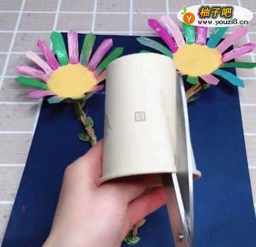 6接着,我们利用一些藤条或者是绿色的卡纸,给他裁剪成藤条都可以再把一个纸杯给他裁剪一半,固定在上面这一幅画就完成了。