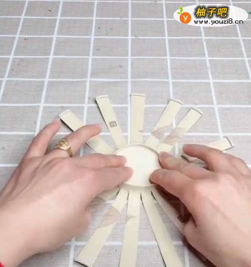3接着,我们将纸杯已经裁剪好的给他按压,在桌面上就会看到,这一种类似于太阳花的纸杯形状。