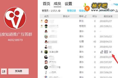 6选择想要删除群成员,并将鼠标放在该成员的名片上,点击最后的“×”,即可成功将该成员从该群中删除了。