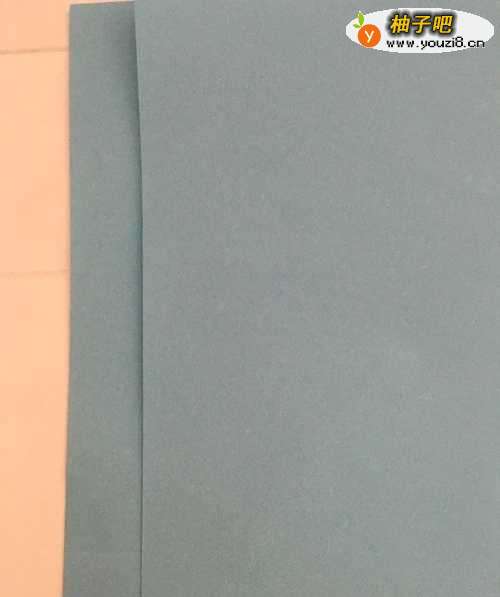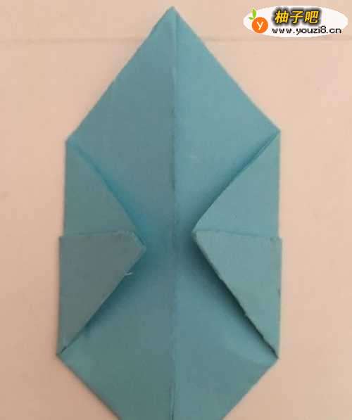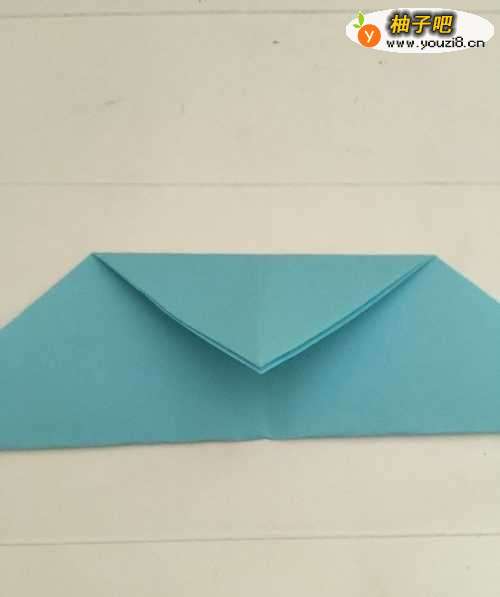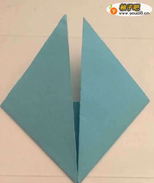 第一步 把一张15厘米X15厘米的蓝色彩纸 从下向上对角折叠成三角形