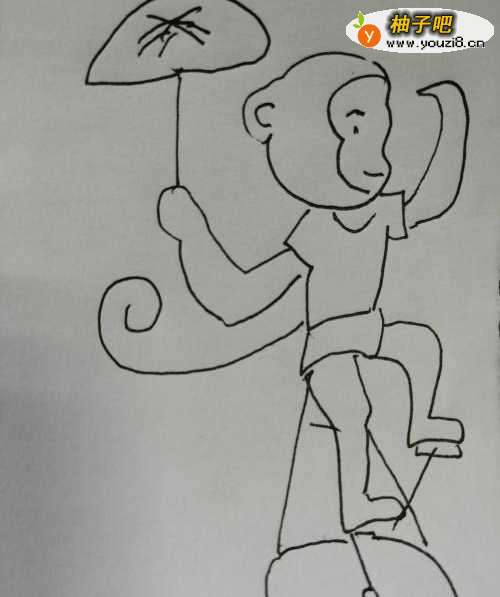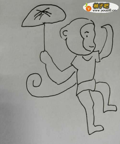 6第六步,然后在机灵的小猴子的手上画出一把雨伞,注意雨伞轮廓的画法。