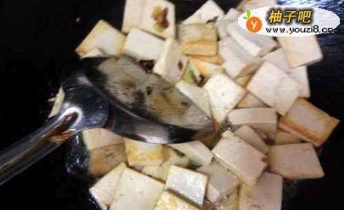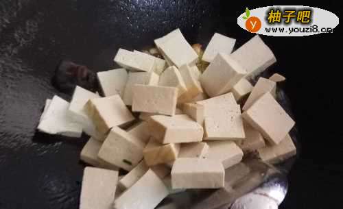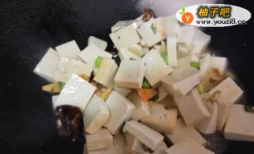 3将炒锅中放入适量的食用油,开火,待油微热后,放入切好的葱、姜、蒜,炸制微黄后,将切好的豆腐放入锅中,翻炒均匀。