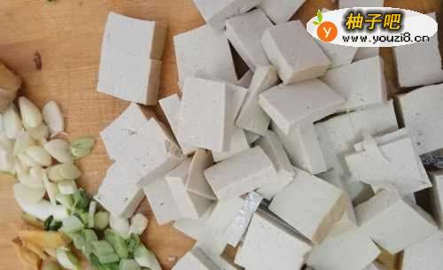 将买来的豆腐块用水冲一下,然后切成小方块约2*2*0.6厘米;将葱、蒜剥好,冲洗干净,将葱切成小斜段,将蒜切成蒜片,将姜洗干净切成粗姜丝。
