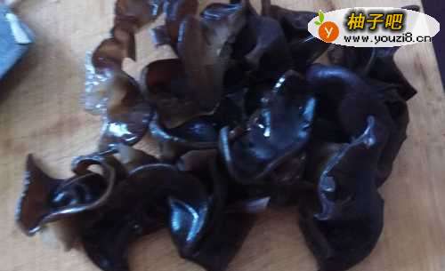 2将木耳提前1小时泡开后,用手揉一揉,然后,再揉洗冲洗2~3遍,冲干净后,将大块撕成小片。