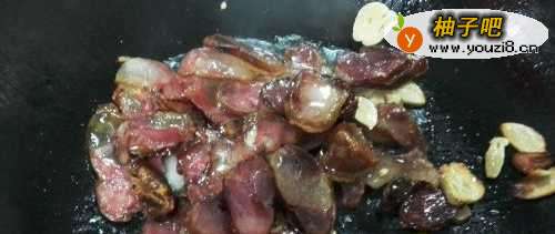 3热锅热油,先将大蒜子、腊肠爆香,翻炒一两分钟即可。