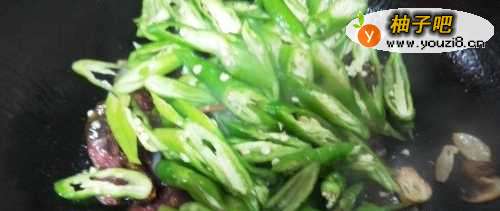 4再加入青椒同炒,火要大。同时加入盐,这样可去辣。