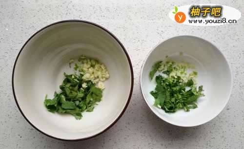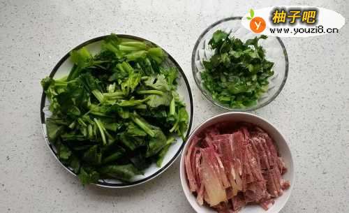 把牛肉却成片状,放入碗中备用;把菠菜洗干净切成段,放入碗中备用;把香菜切成小段,最好碎一点放入碗中备用。