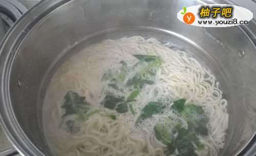 4煮面的水开了,我们把面条放进去,煮三分钟左右后,把菠菜放入一起煮,再煮3到5分钟面就好了。