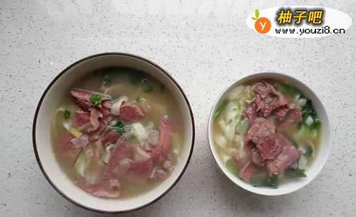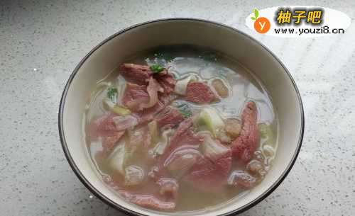 6再把刚刚煮好的牛肉汤浇在面上就可以了,吃的时候要搅拌均匀,把碗底的蒜末和香菜搅上来,香味会扑鼻而来!