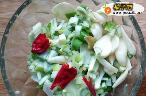 2准备两份葱、姜、蒜、辣椒:一份切大一点炝锅用,另一份切成碎末要放在碗底调味儿用(为了节省时间,这时候可以把煮面的水也烧上了)。