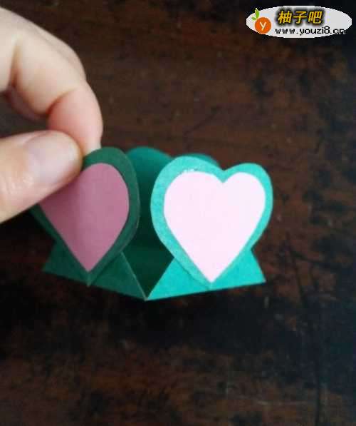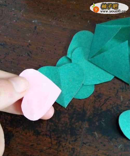 4我们先在粉色的心形上涂上胶水,把它贴在绿色的心形上。其他的心形依次操作。