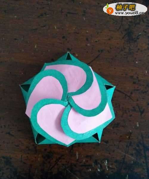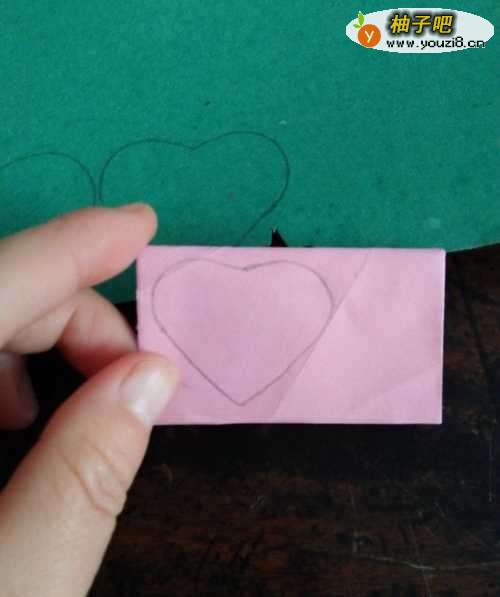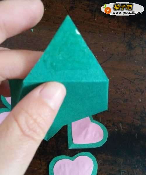 5然后我们再把折起来的三角形上涂上胶水,把刚才粘好的心形粘在上面。