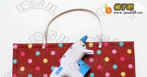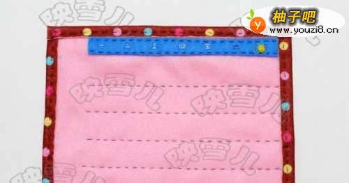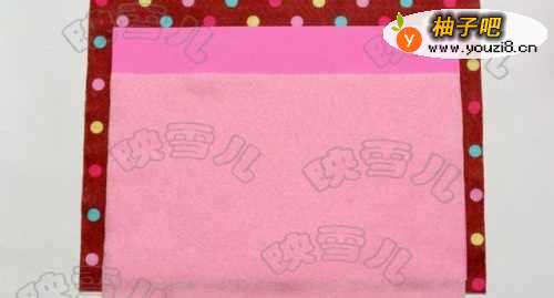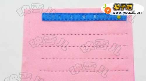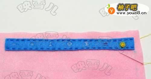 4裁出2*21CM的蓝色不织布长条,将它缝在粉红不织布的顶部。(如果不缝可用热溶胶粘贴)