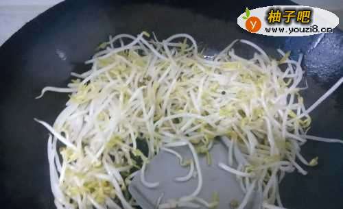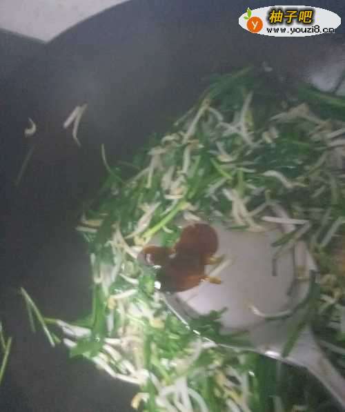 3爆香后倒入绿豆芽翻炒一会,然后加入切好的韭菜继续翻炒。下面我们就要放调味料:适量盐、南德。我们在加调味料时也要注意翻炒,以免菜糊。