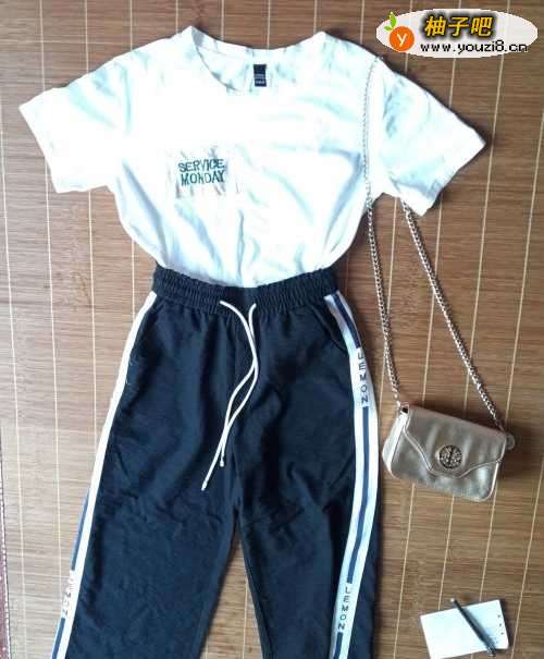2接着第一个这个图的是白体恤+运动阔腿裤,阔腿裤是永远不会过时的,像腿粗的妹子特别适合穿阔腿裤,小编这条阔腿裤面料是蛮特别地的,在夏天穿挺凉快的,然后小编搭了一个夏天的金色包包,这样搭看起来比较休闲