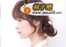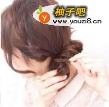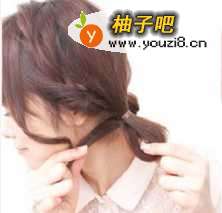 2先扎左边,沿着刘海的边沿取出一股头发,分为两部分,然后将这两部分扭到一起。