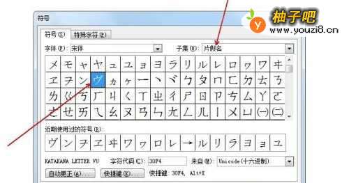 5则片假名ヴ就插入到文档中的对应位置了。然后关闭“符号”对话框。