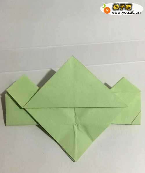 2第二步 折叠完之后 旋转一下 上角(实角)放在下边 然后拿起左下角和右下角都沿中线向上折叠整齐 最后掀起来上角单页向下拽 顺势把当中的两个双三角向两边压倒