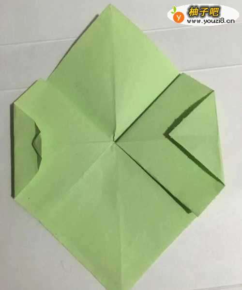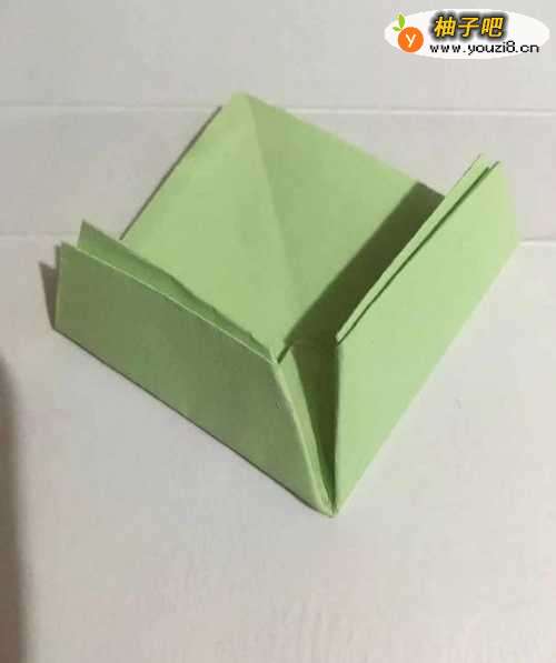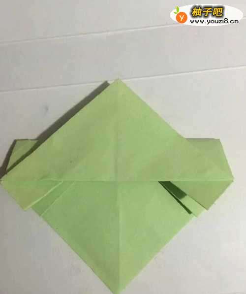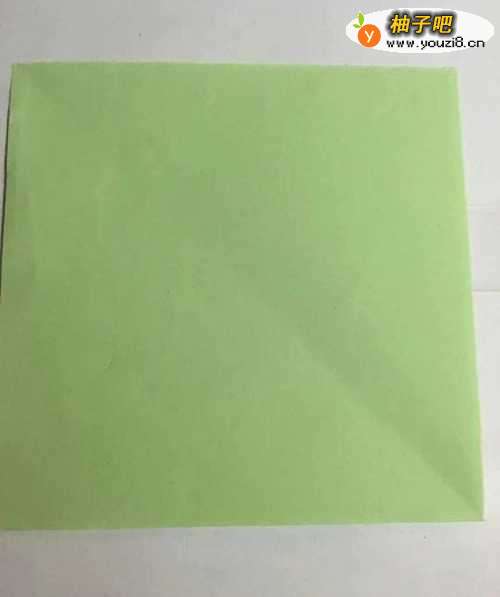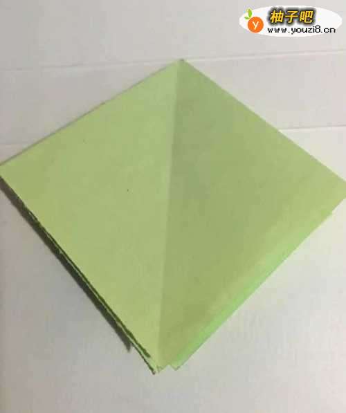 第一步 把一张16厘米的正方形粉绿色彩纸 折叠成一个双正方形 然后拿起下角向上折叠至中心后取开 然后再把上角向下折叠至中心
