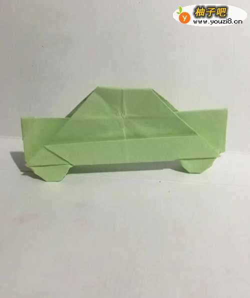 6第六步 塞进底盘之后 上下翻过来 把小汽车顶部的三角折向背面 把每一个轮胎的尖角也折进背面 折叠完之后 整理一下 一辆漂亮的小汽车就折叠完成了
