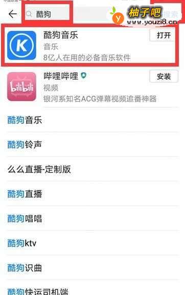 2在罩爱应用市场的搜索栏中输入“酷狗”,点击“搜索”,出现的酷狗音乐进行下载并且安装