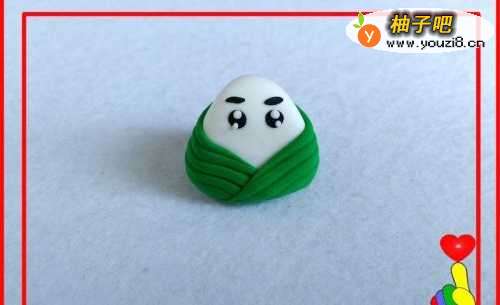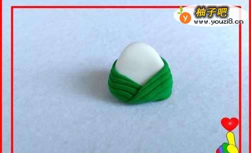 11再取绿色彩泥适量,制作“粽子”头发形状。
