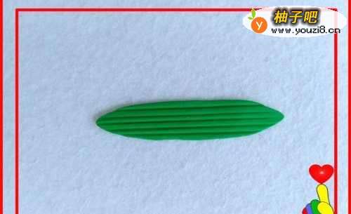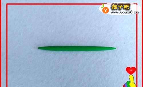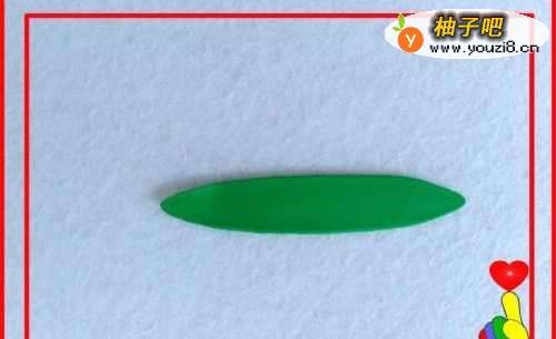 3取绿色彩泥适量,滚搓成两头尖的细长条。