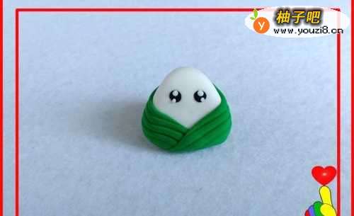 7取黑色彩泥适量,制作两个小圆片,作为粽子的“眼睛”。